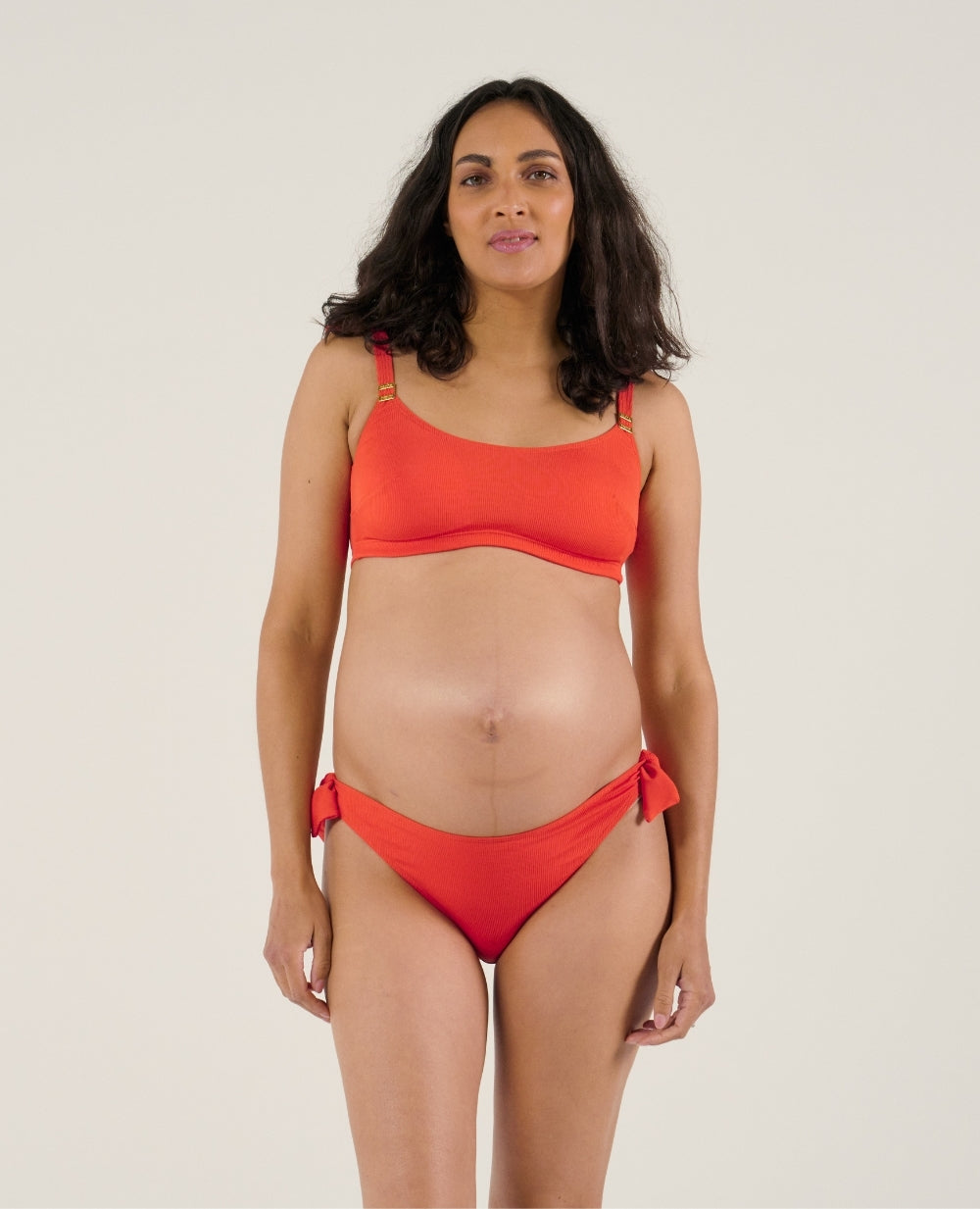 The Porto Vecchio Orange maternity bikini combines style and comfort with its finely ribbed textured fabric and built-in cups.